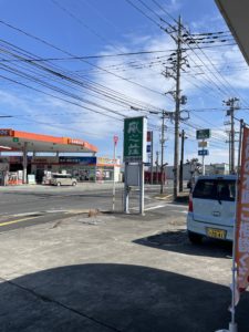 国道沿い,遠藤石油の向かい,風の荘さんの看板が立っているところが駐車場 建物の上には黒川商店の看板が 道路沿いに笑顔ノ実の電工看板がついてます。